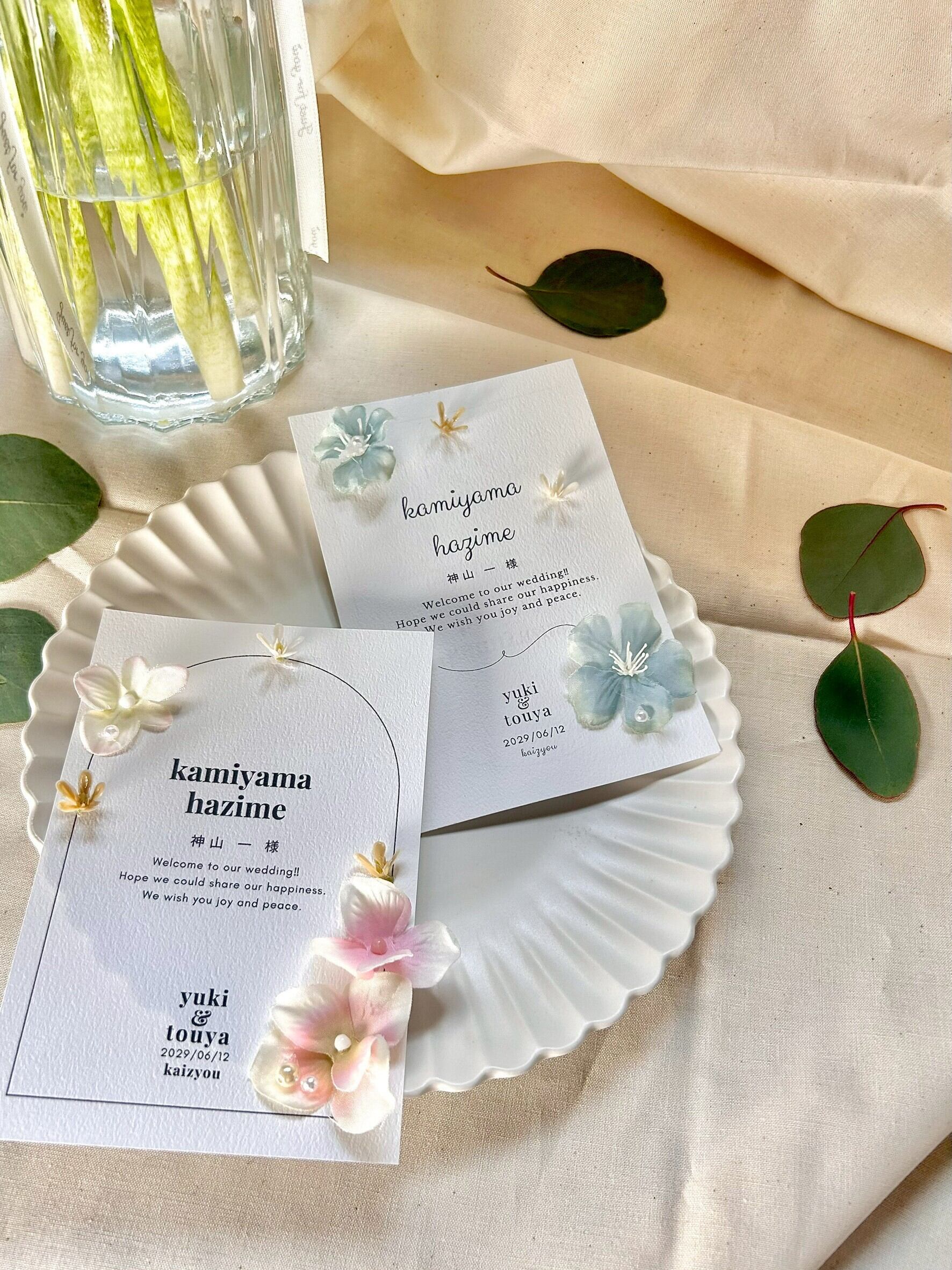 花(造花)の装飾は席札/ペーパーアイテムのオプションになります。