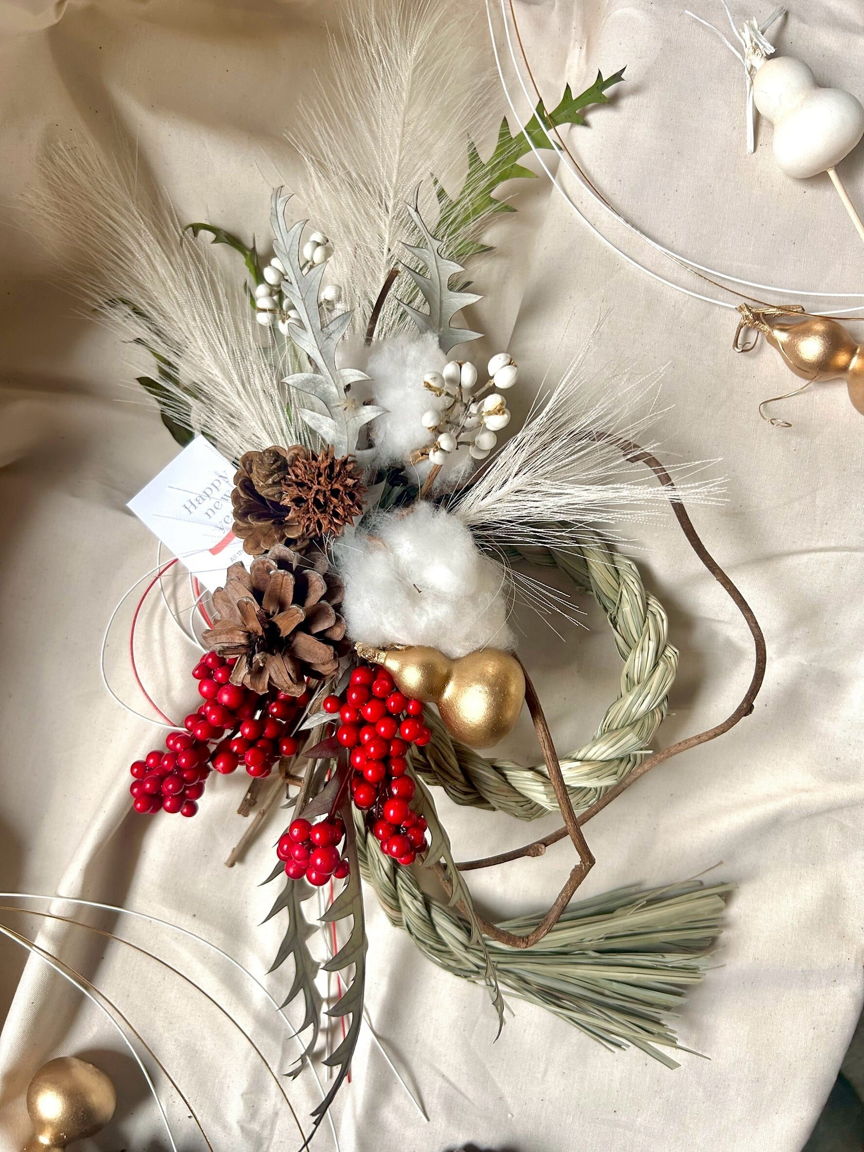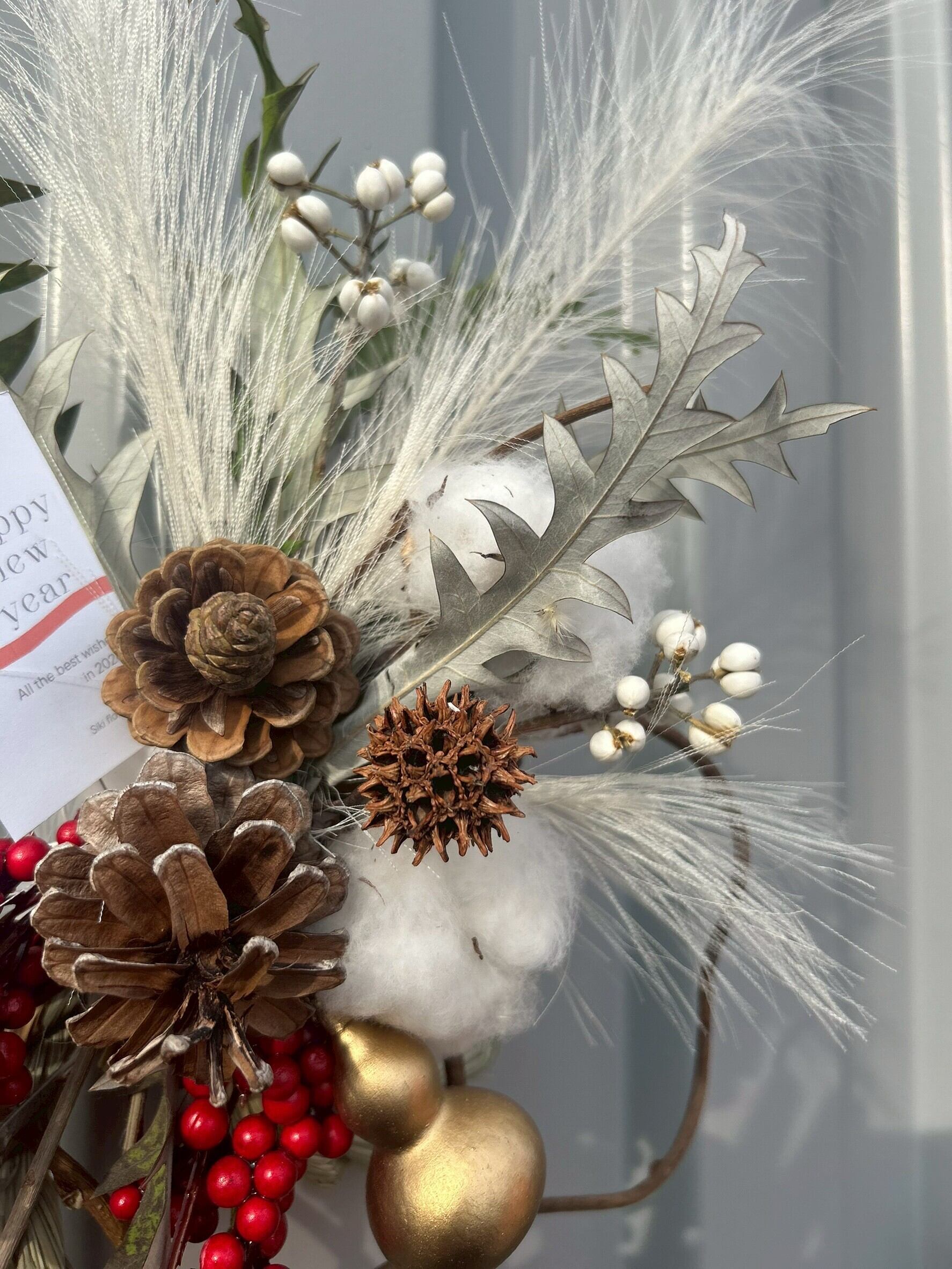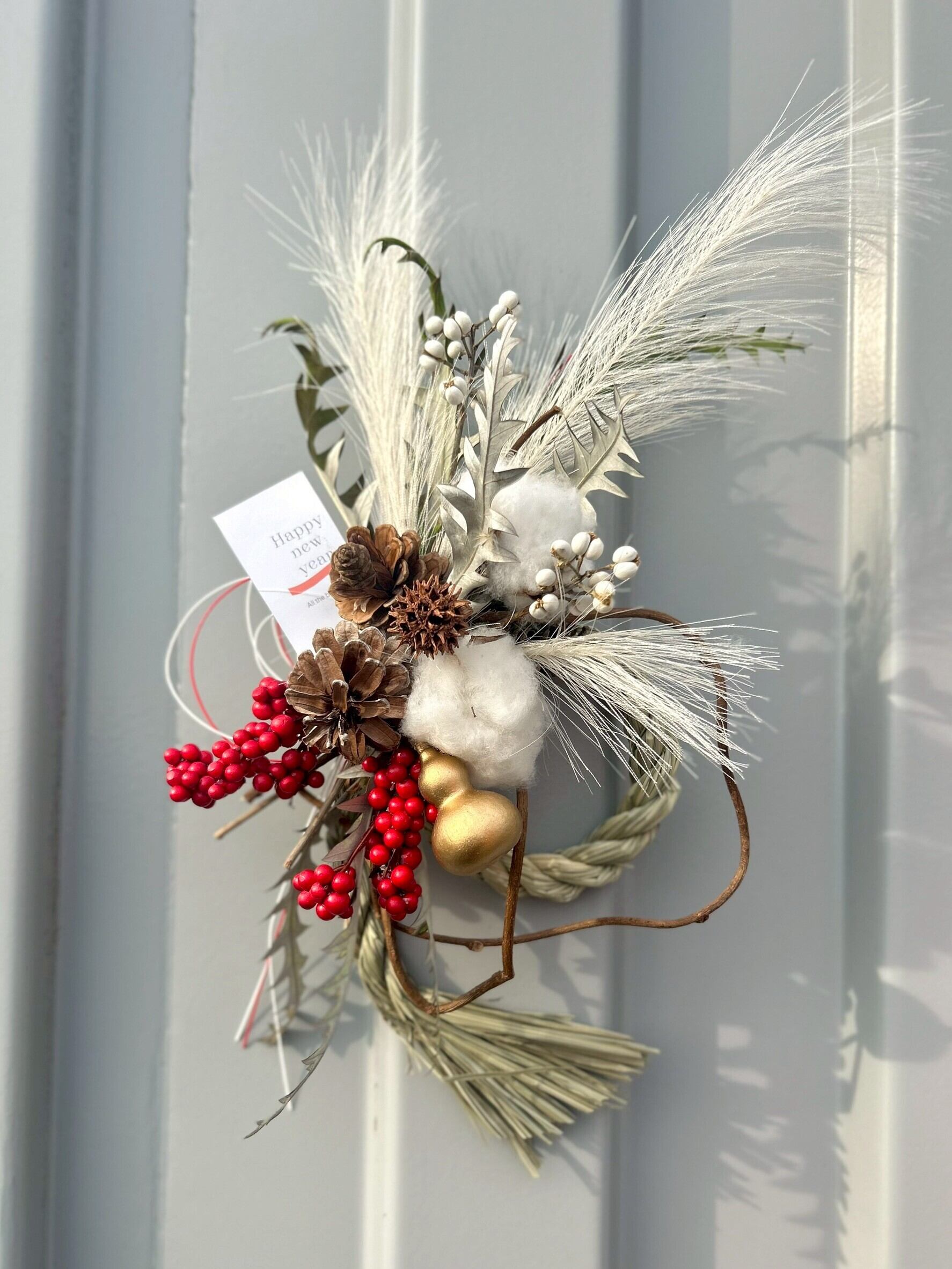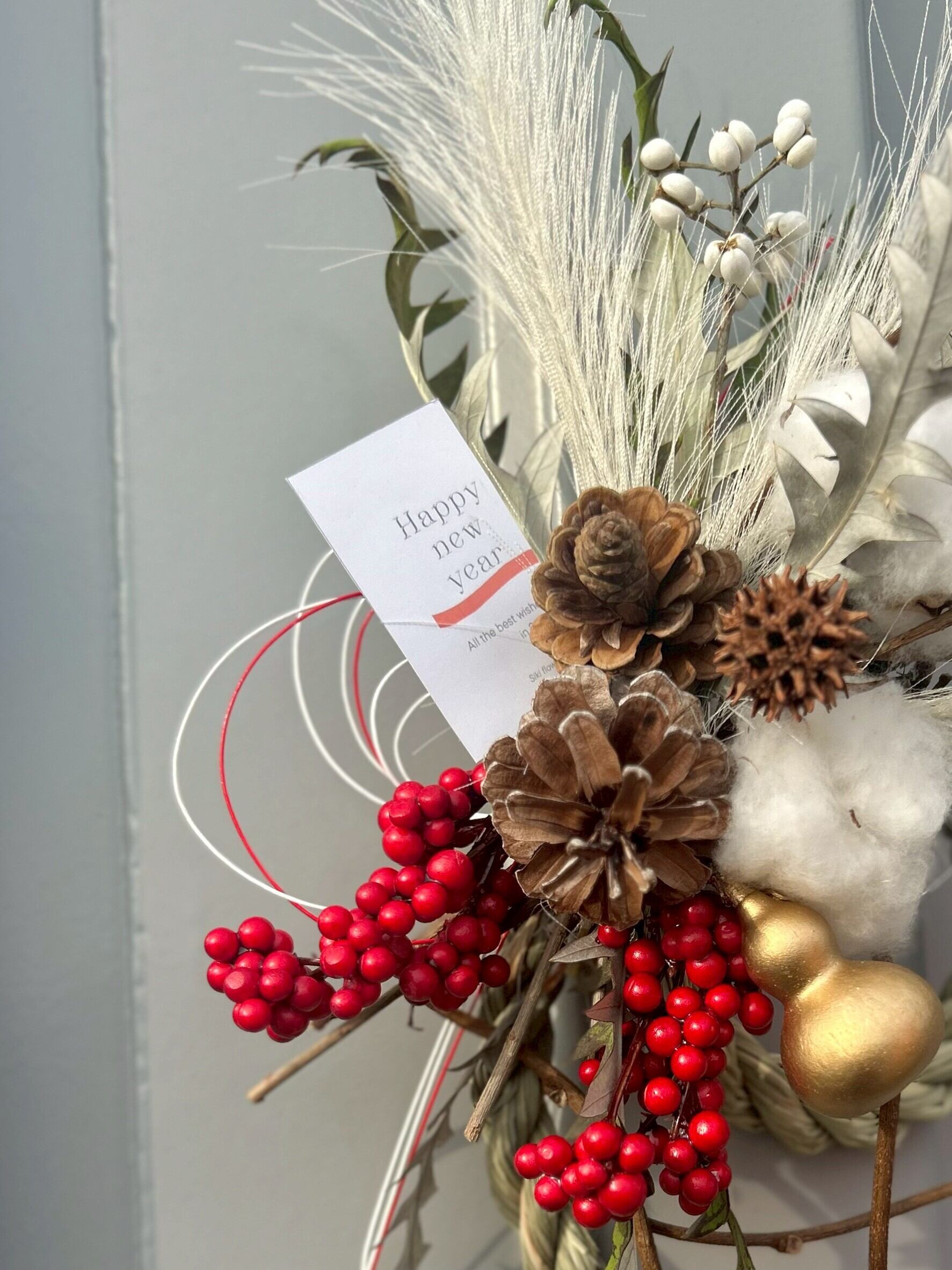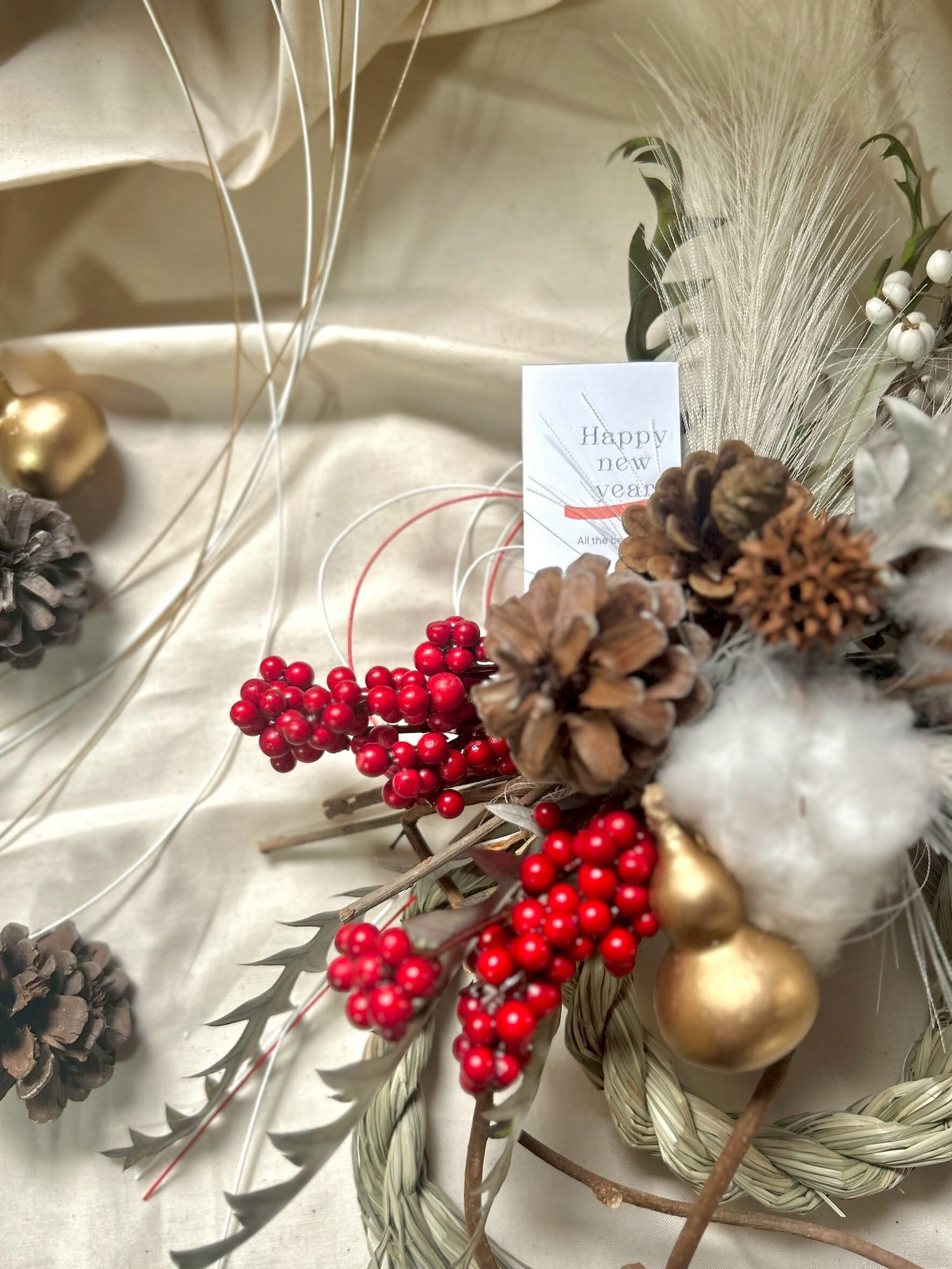 主にドライフラワーでお作りしているため、保管をきれいにしていただければ来年もお使いすることも可能です。