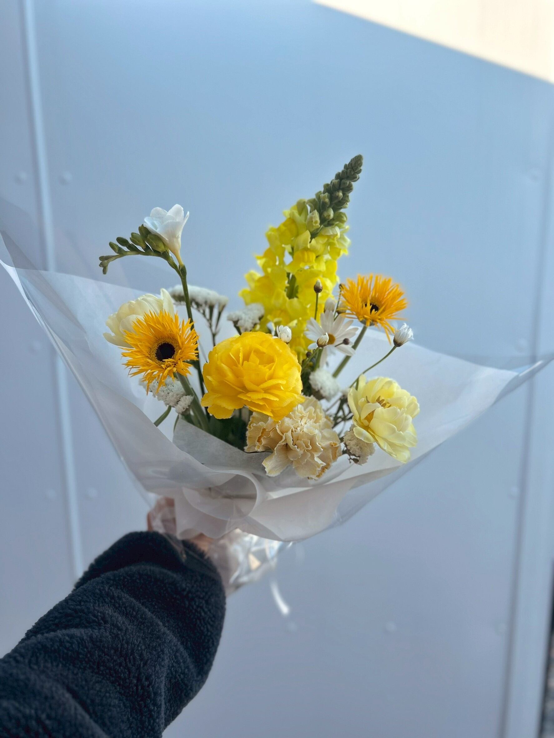 可愛らしいミニサイズのワイヤーベース[Yellow]に合わせたお花をお作りします。